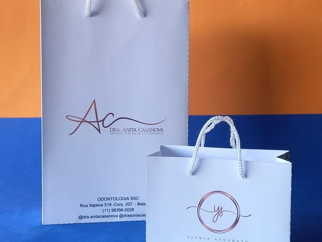 10 unidades Sacola personalizada com papel off set 180 gramas, medida 15x9 cor branca ou cores claras, com logo impresso de 1 lado, alça poliéster branca ou preta