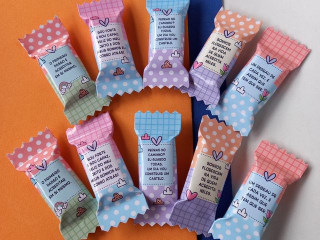 20 unidades card medida 10x7 com balas personalizadas fixadas - embalagem com saco plástico individual